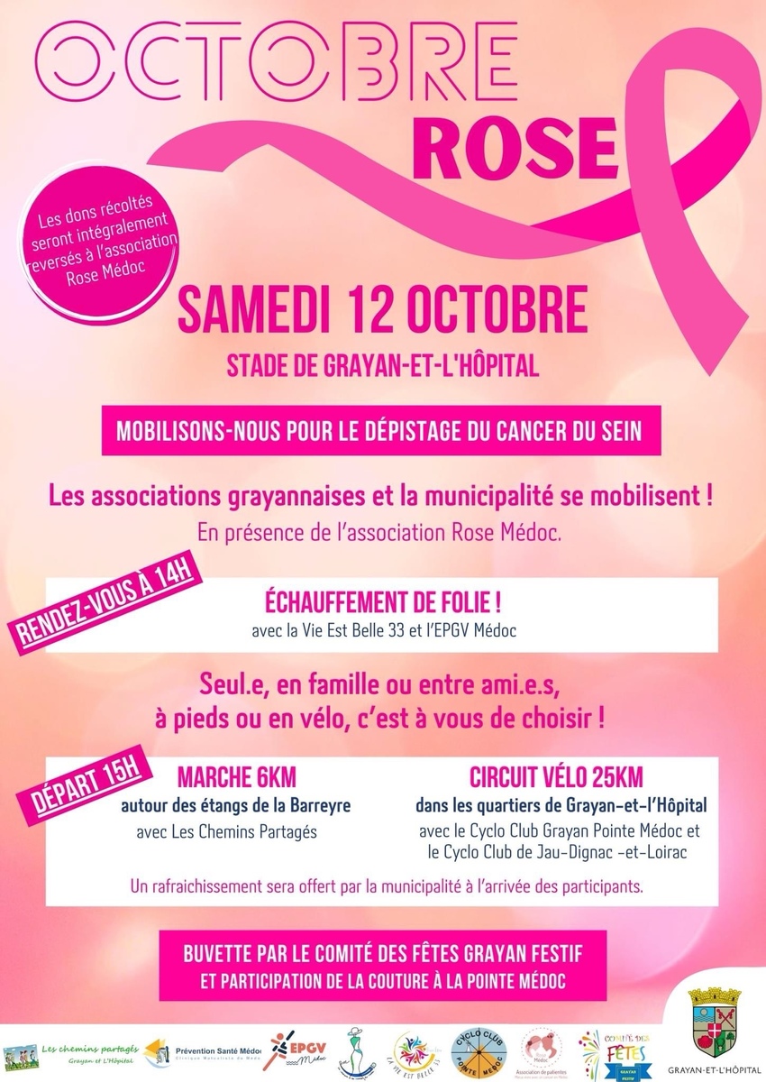 La municipalité et les associations grayannaises se mobilisent pour lutter contre le cancer du sein. À l’occasion d’Octobre Rose, la campagne nationale dédiée à la sensibilisation au dépistage du cancer du sein, la municipalité de Grayan-et-l’Hôpital et les associations grayannaises s’associent pour organiser un après-midi sportif et solidaire :