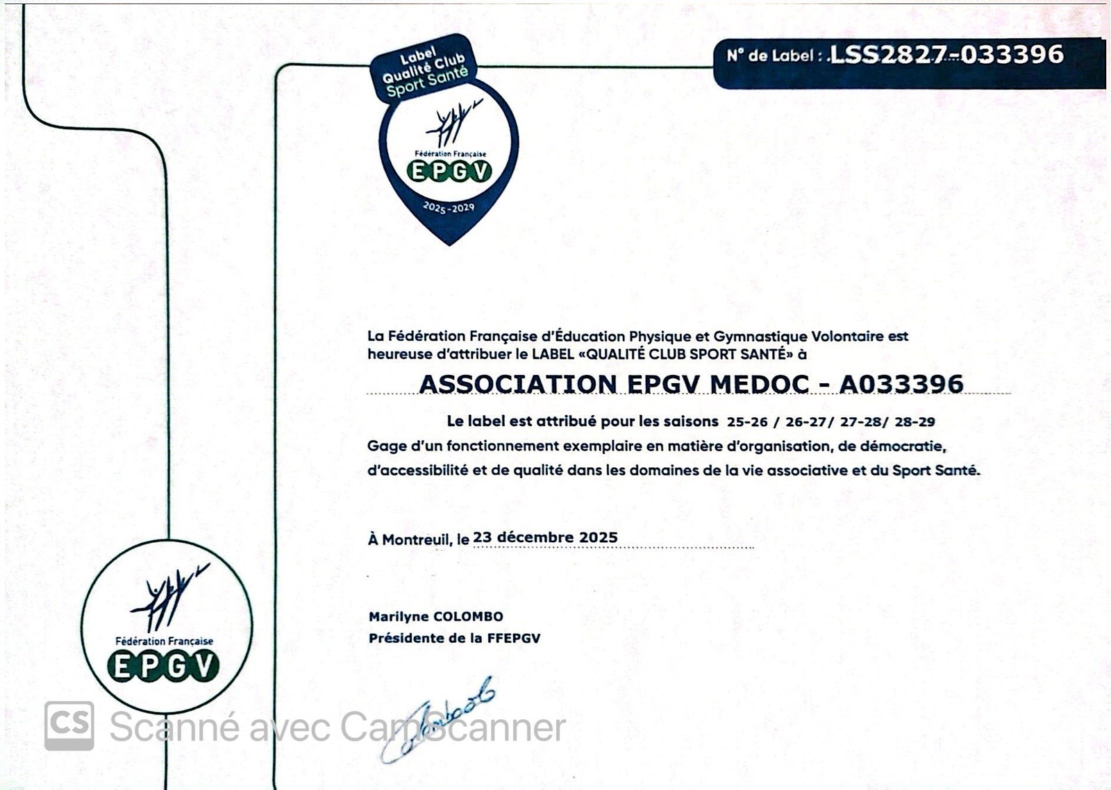 Nous avons la joie d'avoir reçu notre label qualité Sport Santé.